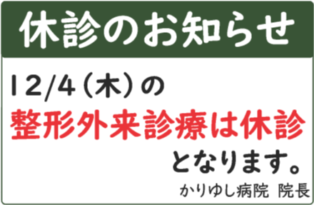 12/4(木)の整形外科外来は休診となりますので、お知らせいたします。